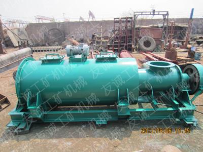 除塵器處理回收的粉塵由星型卸料閥將灰塵送入機(jī)體內(nèi)的螺旋輸送葉片上,經(jīng)螺旋推入加濕攪拌主筒,在螺旋體均勻的拌料下,水噴淋均勻注入料內(nèi),在勻速攪拌的作用下,使粉塵加濕,加濕后的粉塵在多柱螺旋線性的推力作用下,從出料口緩緩送出,卸入機(jī)體外的粉塵運(yùn)送裝置。在螺旋體的勻速運(yùn)轉(zhuǎn)時(shí),振動(dòng)裝置間歇性的工作,使拌料筒周壁等變幅振蕩,將加濕后的粘性粉體與金屬筒壁脫離, 送 卸料口排出。
